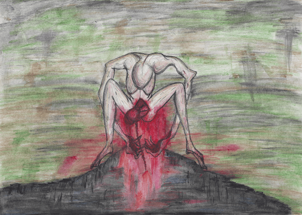 D’après un rêve opheliah 19 juin 2023 2 juillet 2023 21x29.7 cm - 2009 - Dessin, sur feuille format A4, stylo bic et crayons aquarellables